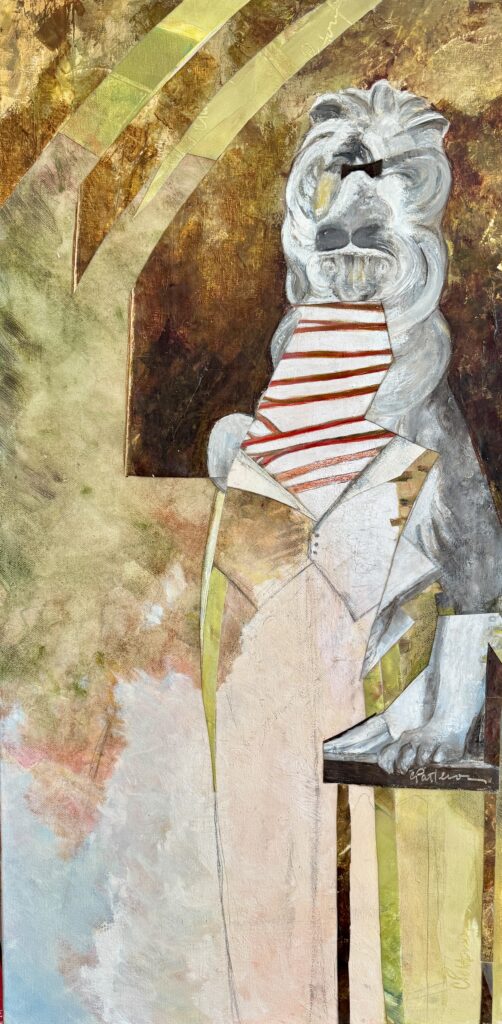 a painted memory from a beautiful vineyard in Tuscany. I had never been satisfied with the final image, and had added it to the canvases that were destroyed back then. I had chopped up much of the grey body and rich dark background to use on other tesserae pieces, but obviously had been reluctant to destroy his snarky visage. But here at last, I was able to give him another life. As I cut and snipped, and worked out how to bring the two works together, I realized how prescient a choice I had made to bring him back to life. Using the remains of his former image, and the colors found in his new venue, I freed him from his self-contained, stodgy, and boring, old self. He has been transformed into a hip dude with a down vibe. In his red striped tee, and pink pants, he appears to be at ease with his new identity. And although the stodgy part still lurks, and one supposes he will always have a tendency to prose on and on about great thoughts, there is nevertheless a sense of humor at work just under the surface of that old stone statue.