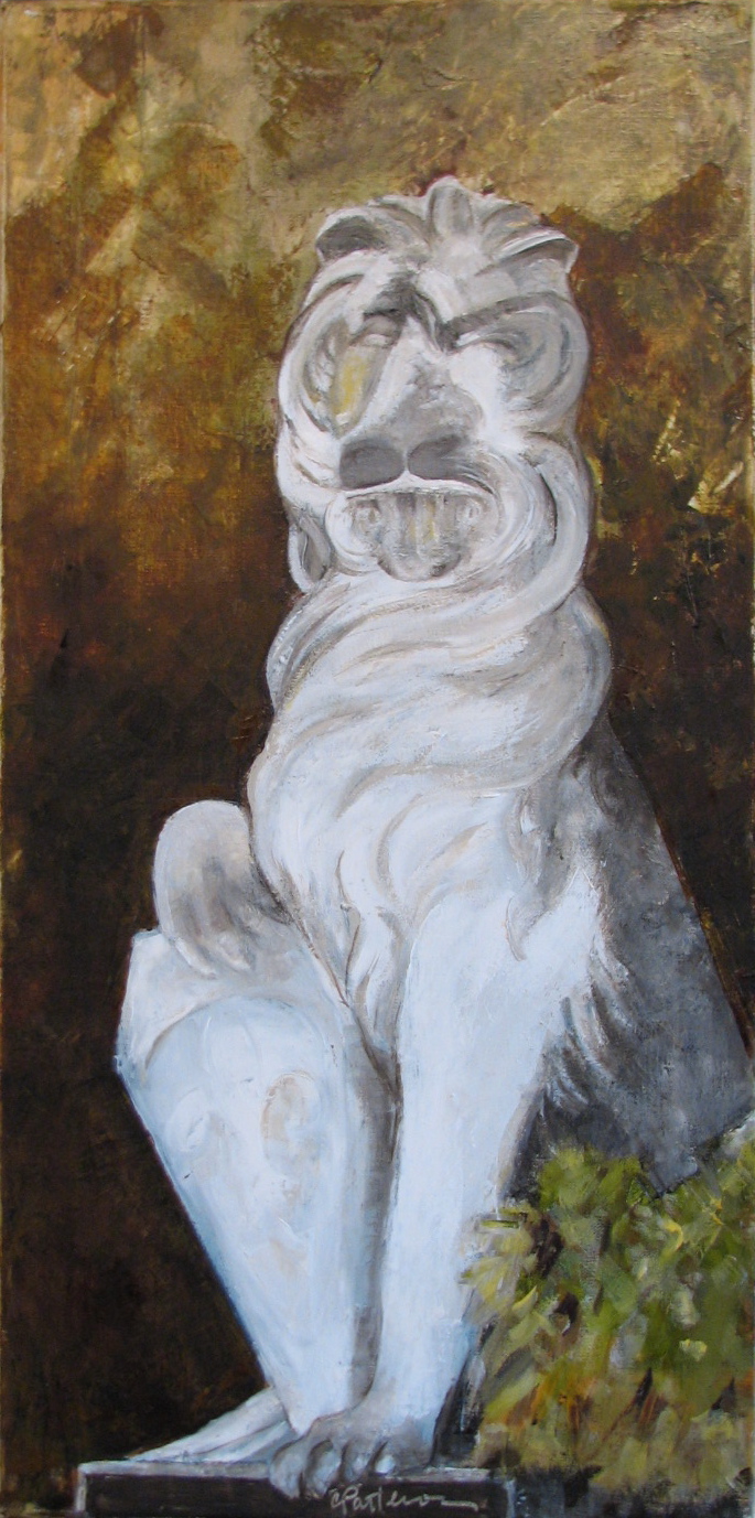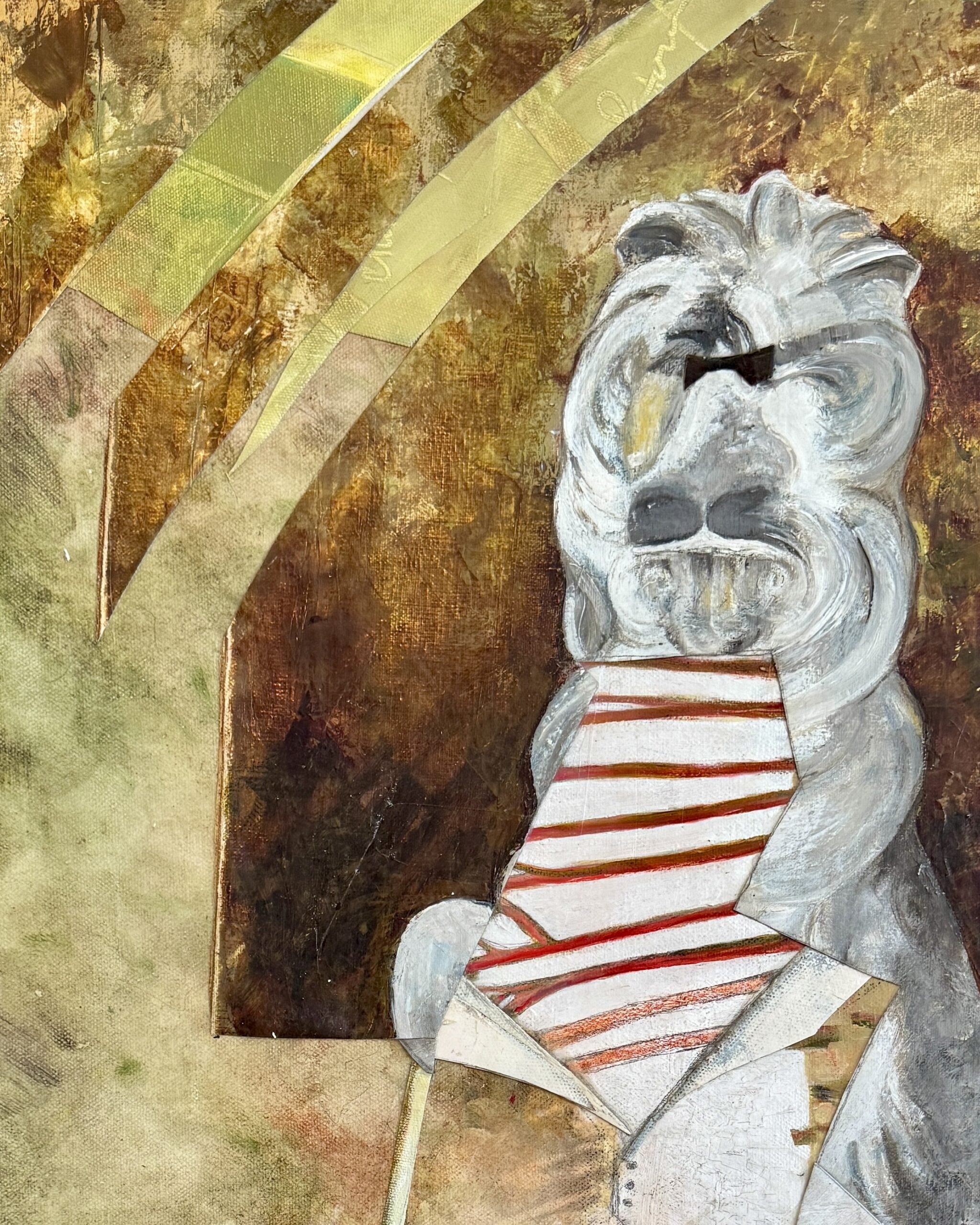 a painted memory from a beautiful vineyard in Tuscany. I had never been satisfied with the final image, and had added it to the canvases that were destroyed back then. I had chopped up much of the grey body and rich dark background to use on other tesserae pieces, but obviously had been reluctant to destroy his snarky visage. But here at last, I was able to give him another life. As I cut and snipped, and worked out how to bring the two works together, I realized how prescient a choice I had made to bring him back to life. Using the remains of his former image, and the colors found in his new venue, I freed him from his self-contained, stodgy, and boring, old self. He has been transformed into a hip dude with a down vibe. In his red striped tee, and pink pants, he appears to be at ease with his new identity. And although the stodgy part still lurks, and one supposes he will always have a tendency to prose on and on about great thoughts, there is nevertheless a sense of humor at work just under the surface of that old stone statue.