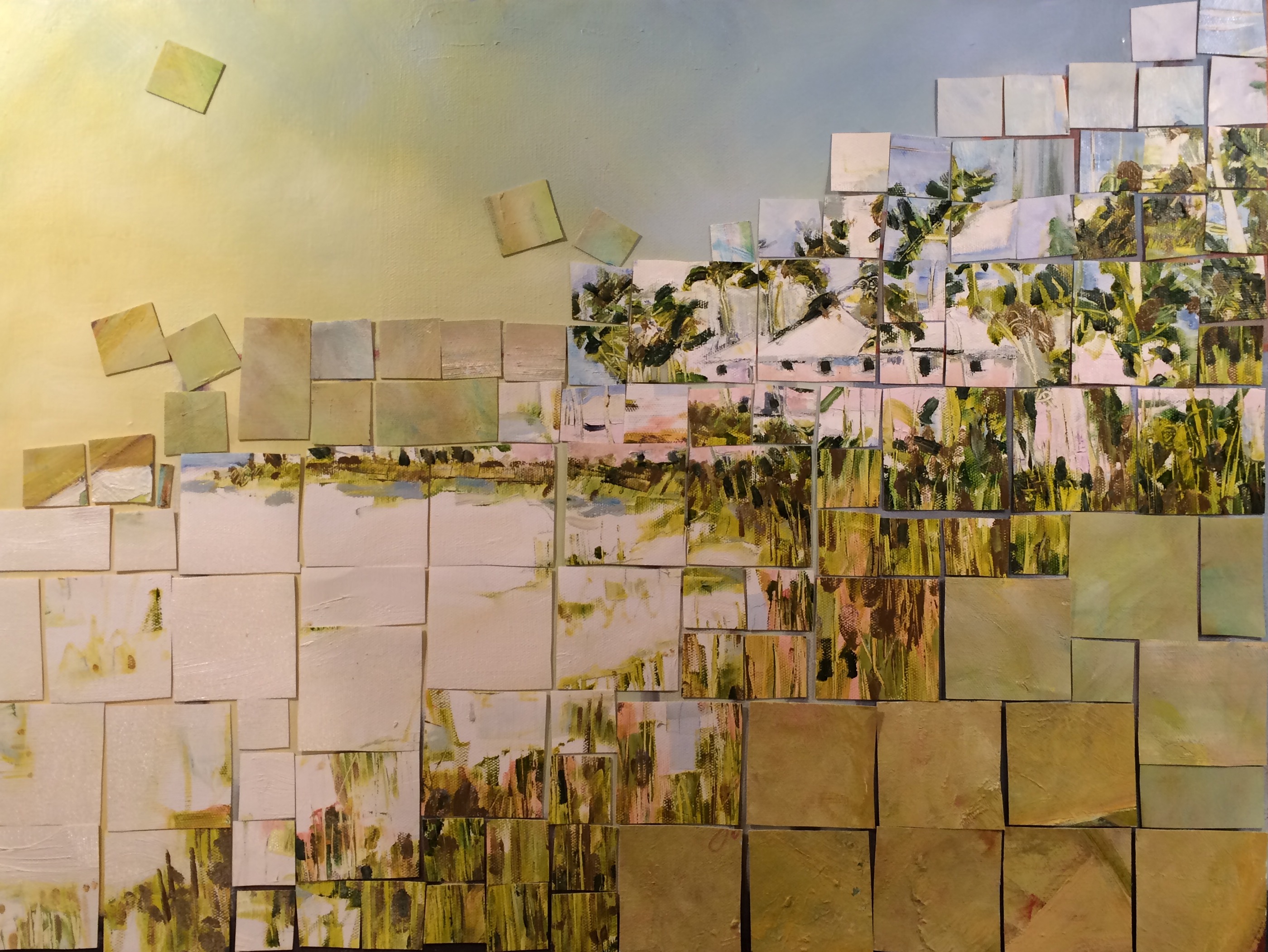 It has been a long-drawn-out winter here, and the extreme cold has meant that I have been unable to use oil paints for the duration. Instead I have been exploring a new technique which I refer to as Tesserae. These, like the piece in progress pictured above, are created using old paintings that have been chopped up and reconfigured to create a new image. In some instances, like this one, I have constructed the new image over and old painting, and in others, I have created an acrylic underpainting specifically for the new work. Sometimes, the new image is a reflection of the original work, and in other instances, there is no contextual relationship between the new image and the old.